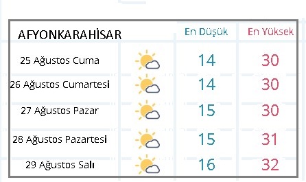 Serin bir haftayı geride bırakmaya hazırlanırken, hava sıcaklığı bugünden itibaren yükselişe geçiyor. Kurban Bayramı'na sayılı günler kala, hava sıcaklığı yurt genelinde yükselişe geçti. Afyonkarahisar’da bugün 30 derece olan sıcaklık gelecek hafta 32 derecelere kadar çıkacak. Gece sıcaklığı ise 15 derece dolayında seyredecek.