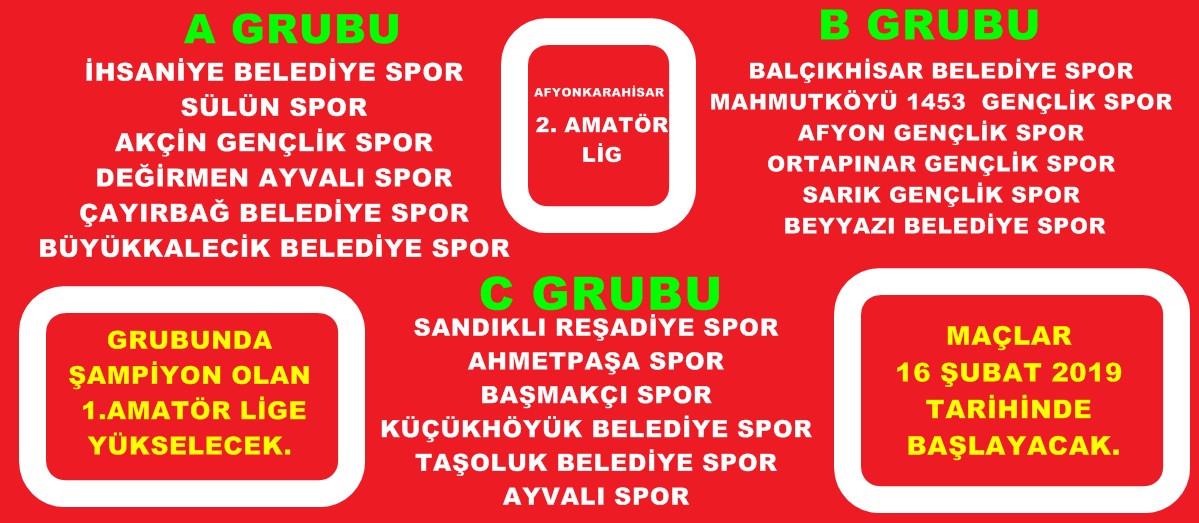 2018-2019 futbol sezonu 2. Amatör Lig fikstürü çekildi.18 takımın( 3) grupta mücadele edeceği lig , çift devre lig usulü ve deplasmanlı olarak oynanacak.Gruplarında şampiyon olan takımlar 2019-2020 futbol sezonunda 1. Amatör ligde yer alacak.Maçlar 16 şubat 2019 tarihinde başlayacak.
