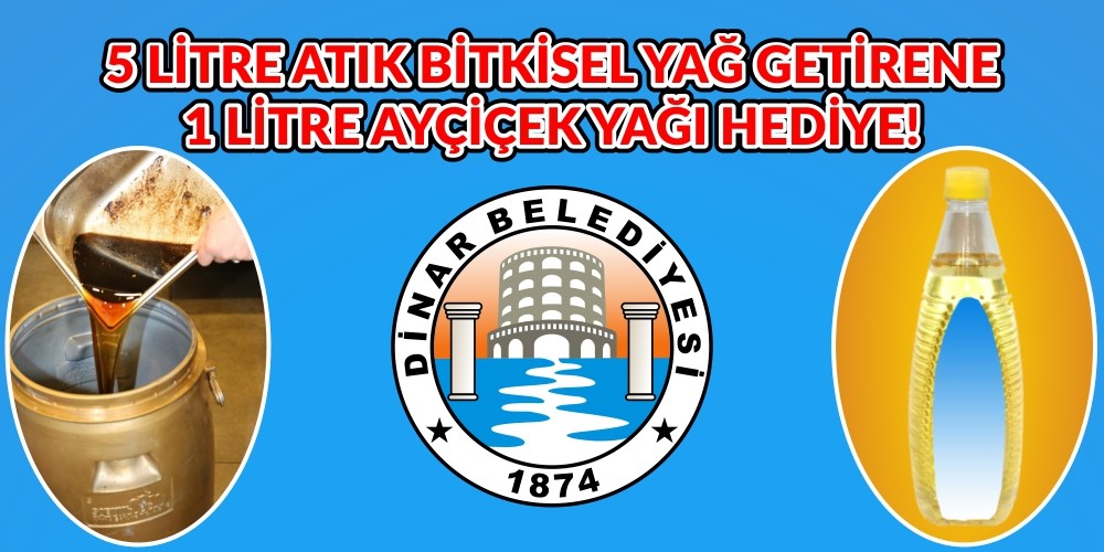 Dinar Belediyesi tarafından “Evlerden Bitkisel Atık Yağ Toplama” kampanyası ile 5 litre kullanılmış bitkisel atık yağ getiren herkese 1 litre Ayçiçek yağı hediye edilecek.