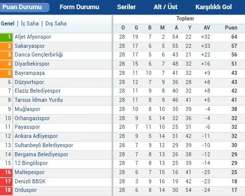 64 puanla Grup Lider Afjet Afyonspor lideri sakaryaspor 7 puan farkla takip ediyor.Sakaryanın puanı 57 Sakaryanın ardından ise 56 puanla darıca gençlerbirliği ve 51 puanlı diyarbekir ve 43 puanlı bayrampaşa takip ediyor.