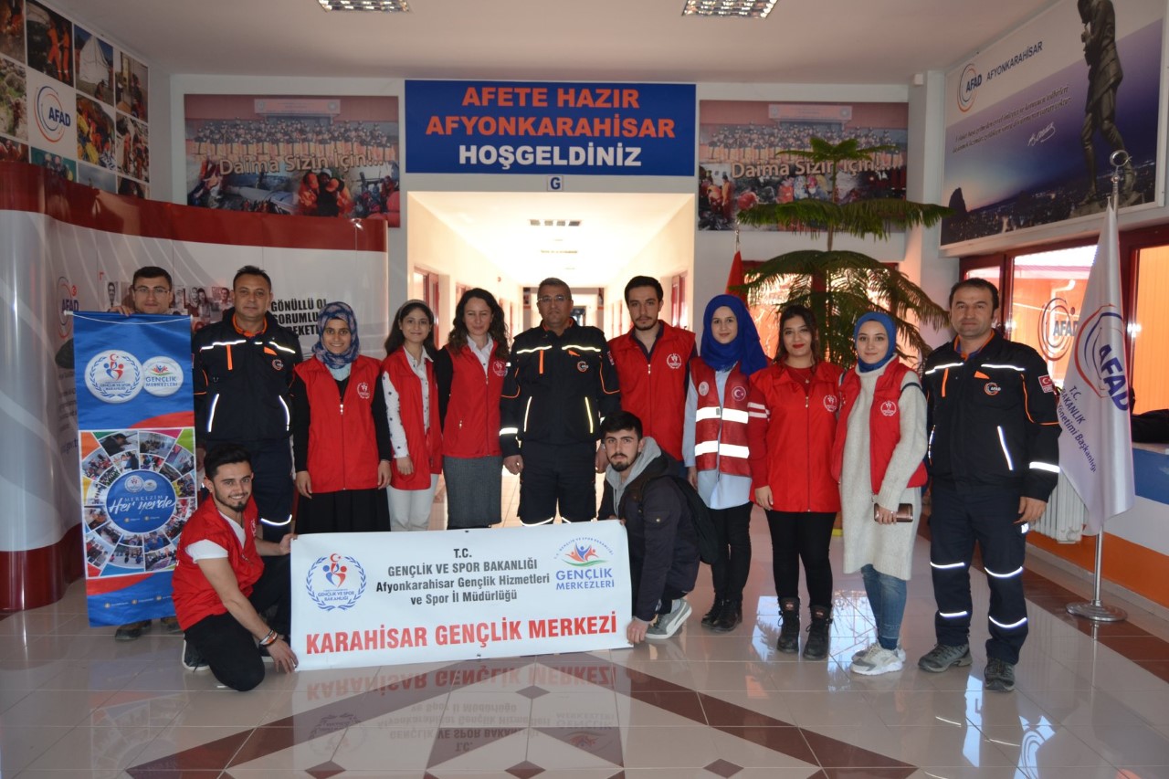 Karahisar Gençlik Merkezi; 28 Şubat Sivil Savunma Günü ve 1-7 Mart Deprem Haftası etkinlikleri kapsamında gençlerin sosyal, kültürel, fiziksel, sanatsal ve serbest zamanlarda toplumla bütünleşmelerini, görev ve sorumluluk duygularını geliştirmelerini sağlamak amacıyla, bünyesindeki gençlik lideri ve gönüllü gençlerle Afyonkarahisar İl Afet ve Acil Durum Müdürlüğü ziyaret edildi. İl Afet ve Acil Durum Müdürü Mehmet BULDAN gençleri makamında kabul ederek ziyaretten dolayı memnuniyetlerini dile getirdi. Her zaman gönüllü ve bilinçli gençlerin AFAD bilincine sahip olması gerektiği önemini gençlere vurguladı. Ziyarette, Gençlik Merkezi lideri ve genç gönüllüler AFAD teknisyenlerinden kullanılan teknik malzemeler ve araç-gereçler hakkında bilgiler aldı.