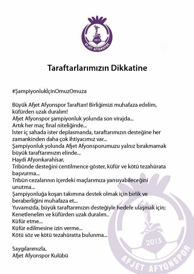 Afjet Afyonspor Kulübü’nden yapılan açıklamada taraftarlara çeşitli uyarılarda bulunuldu. Kulübün açıklamasında şu uyarılarda bulunuldu; ”Yarın ki Şampiyonluk maçında maç başından sonuna kadar sadece takımımızı destekleyelim.