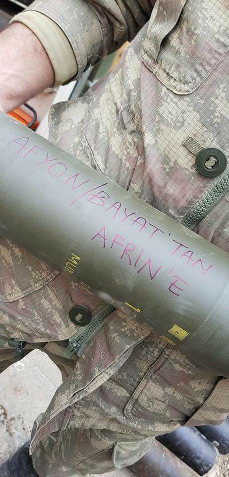 Türk Silahlı Kuvvetleri’nin Afrin’e başlattığı “Zeytin Dalı Operasyonu”na katılan askerlerin morallerinin ne denli yüksek olduğu sosyal medyada paylaştığı fotoğraftan belli olurken, bir askerin obüs mermisinin üzerine “Afyon/Bayat’tan Afrin’e” yazılı fotoğraf paylaşımı büyük beğeni topladı.