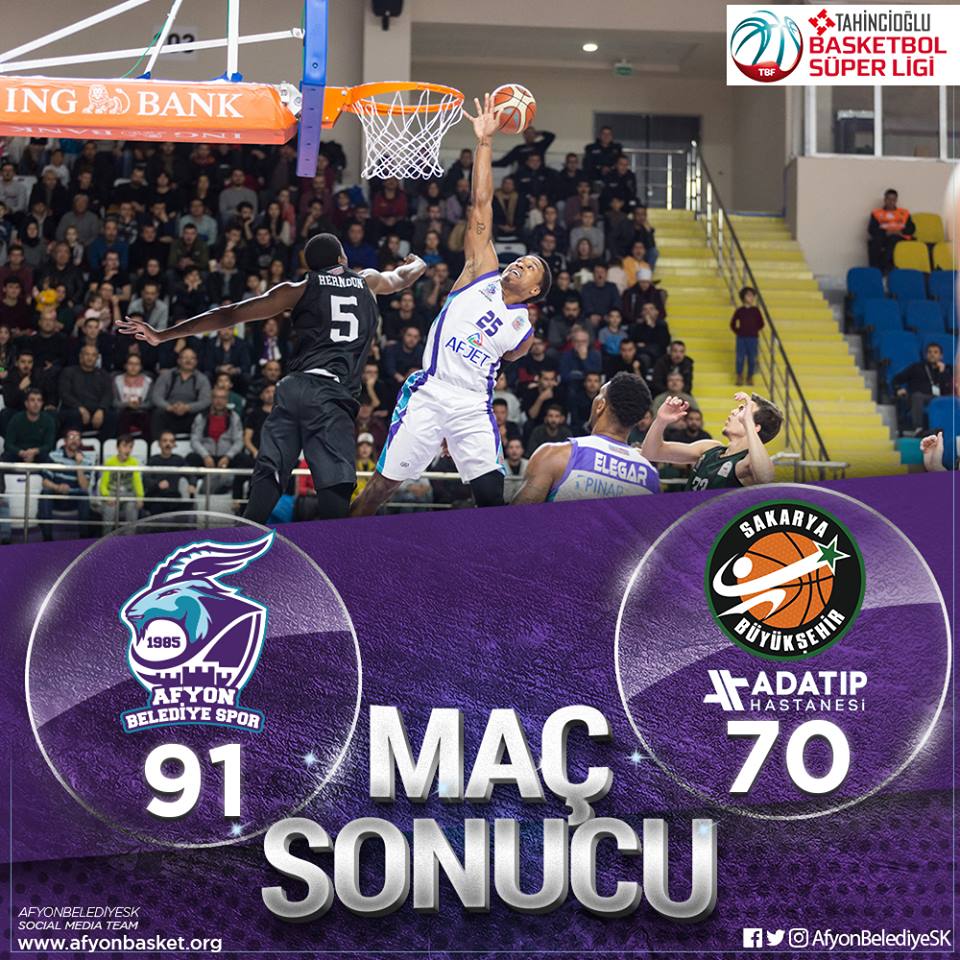 Tahincioğlu Basketbol Süper Ligi 10'uncu haftasında Temsilcimiz Afyon Belediyespor, Adatıp Sakarya Büyükşehir Belediyespor'u 91-70 mağlup etti. Afyonkarahisar’da Prof. Dr. Veysel Eroğlu spor salonunda oynanan karşılaşmayı Ali Şakacı, Ozan Çakar, Kaan Büyükçil’den oluşan üçlü hakem triosu yönetti.