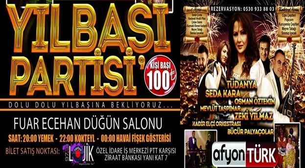 Kaya Medya Grubu yayın organlarından olan Afyon Türk Tv tarafından hazırlanan muhteşem Yılbaşı Partisi programı Afyonkarahisar Merkez’de bulunan Fuar Ecehan Salonunda düzenlenecek. Bu muhteşem eğlence dolu özel geceye katılan ünlüler arasında; Arabeskin Kraliçesi ve Türk Sanat Müziğinin eskimeyen sesi Tüdanya , Ankara’nın güçlü sesi Seda Kara, Türk Halk Müziğinin vazgeçilmezi Osman Öztekin, Afyonkarahisar’ı müthiş Potporileri ile yerinden oynatan Mevlüt Taşpınar, Yörüklerin vazgeçilmezi Afyon’lu Zeki Yılmaz, Usta Kadrosu ile Kadir Elçi Orkestrası bu muhteşem gecede seyircilerinin karşısına çıkarken , çocukların çok sevdiği bücür Palyonçolar mu muhteşem geceye eşlik edecek. Dans, müzik, eğlence ve sohbetin sınırlarının zorlanacağı yılbaşı gecesinde unutulmaz anılarla 2019 yılına merhaba denilecek. Bu muhteşem yılbaşı gecesi birbirinden güzel şarkılarla konser tadında geçecek