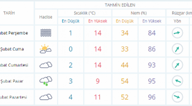 Meteoroloji Genel Müdürlüğü'nden alınan tahminlere göre, hava sıcaklığının yurt genelinde artarak mevsim normalleri civarında seyredeceği tahmin edilen Afyonkarahisar’da yarın az bulutlu bir hava hakim olacak. Meteoroloji Genel Müdürlüğünden alınan tahminlere göre, hava sıcaklığı 14 derece dolayında seyredecek. Yağışlı geçmesi beklenen Pazar günü gündüz sıcaklığının 5 derec birden düşerek 9 dereceye ineceği Afyonkarahisar’da rüzgarın, genellikle güneyli yönlerden hafif, ara sıra orta kuvvette esmesi bekleniyor.Arif Yağcı