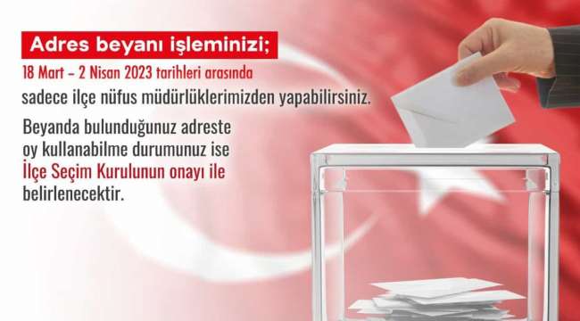 14 Mayıs 2023 ‘de yapılacak olan Milletvekilliği ve Cumhurbaşkanlığı seçimi nedeniyle adres beyanı işlemleri 18 Mart-2 Nisan 2023 tarihleri arasında adres beyanı işlemleri yalnızca ilçe nüfus müdürlüklerimizden, İlçe Seçim Kurulunun onayı ile yapılabilecektir.