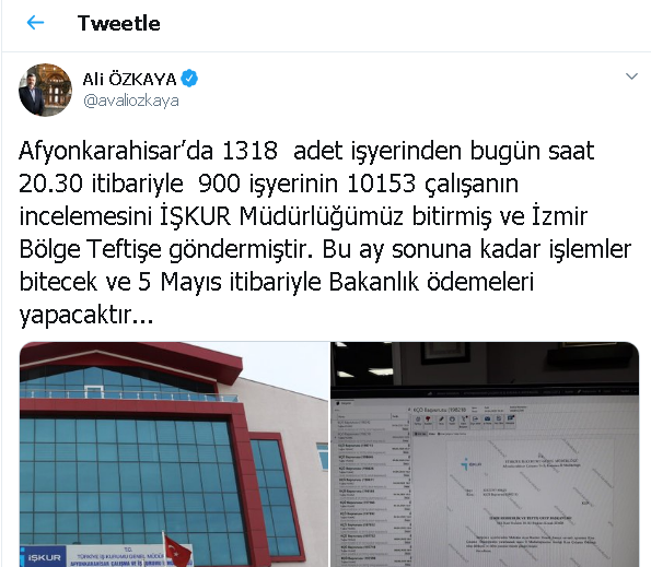 Ak Parti Afyonkarahisar Milletvekili Ali Özkaya, konuyla ilgili sosyal medya hesabından şu paylaşımda bulundu: “Afyonkarahisar’da 1318 adet işyerinden bugün saat 20.30 itibariyle 900 işyerinin 10153 çalışanın incelemesini İŞKUR Müdürlüğümüz bitirmiş ve İzmir Bölge Teftişe göndermiştir. Bu ay sonuna kadar işlemler bitecek ve 5 Mayıs itibariyle Bakanlık ödemeleri yapacaktır...”