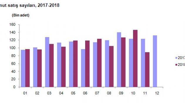 Türkiye genelinde konut satışları 2018 Kasım ayında bir önceki yılın aynı ayına göre %27 oranında azalarak 89 626 oldu. Konut satışlarında, İstanbul 16 058 konut satışı ve %17,9 ile en yüksek paya sahip oldu. Satış sayılarına göre İstanbul'u, 7 834 konut satışı ve %8,7 pay ile Ankara, 4 773 konut satışı ve %5,3 pay ile İzmir izledi. Konut satış sayısının düşük olduğu iller sırasıyla 8 konut ile Hakkari, 22 konut ile Ardahan ve 33 konut ile Bayburt oldu.