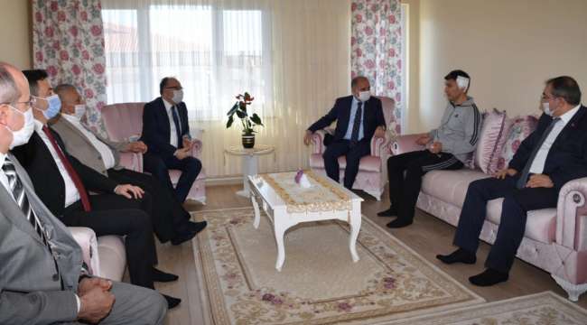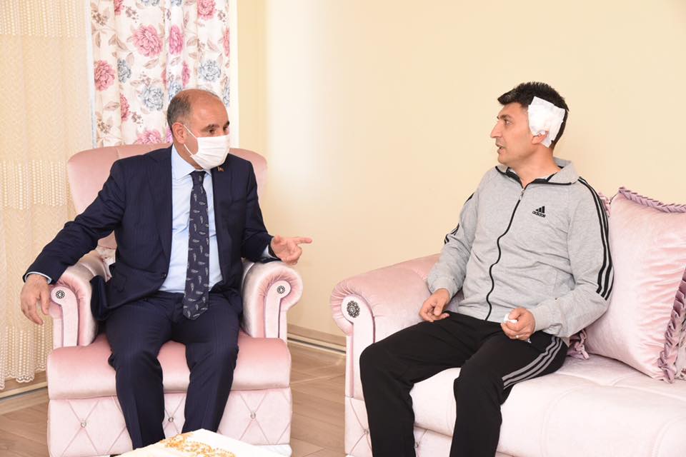 Polise kürekle saldıran akli dengesi bozuk vatandaş tarafından yaralanan polis memurunu Emniyet Genel Müdürü Mehmet Aktaş ve beraberindeki heyet evinde ziyaret etti