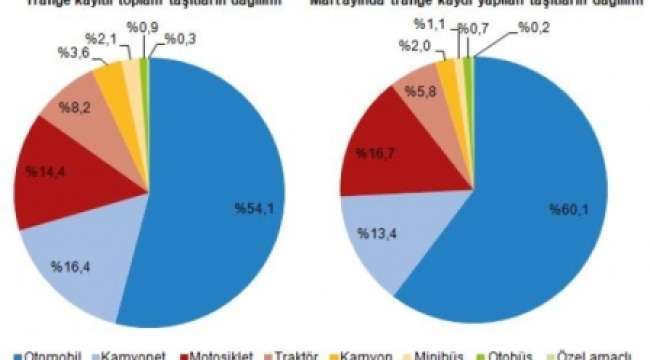 Mart ayında trafiğe kaydı yapılan taşıtların %60,1'ini otomobil, %16,7'sini motosiklet, %13,4'ünü kamyonet, %5,8'ini traktör, %2,0'ını kamyon, %1,1'ini minibüs, %0,7'sini otobüs ve %0,2'sini özel amaçlı taşıtlar oluşturdu.