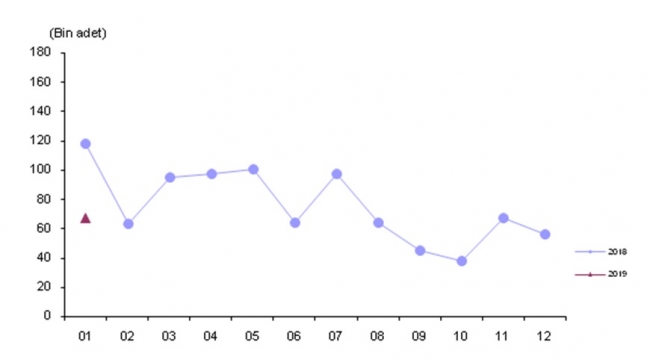 Ocak ayında geçen yılın aynı ayına göre trafiğe kaydı yapılan taşıt sayısında %43,4 azalış gerçekleşti. Bu azalış otomobilde %39,9, minibüste %52,1, otobüste %11,7, kamyonette %54,6, kamyonda %62,8, motosiklette %10,9, özel amaçlı taşıtlarda %66,2, traktörde ise %67,8 olarak gerçekleşti.
