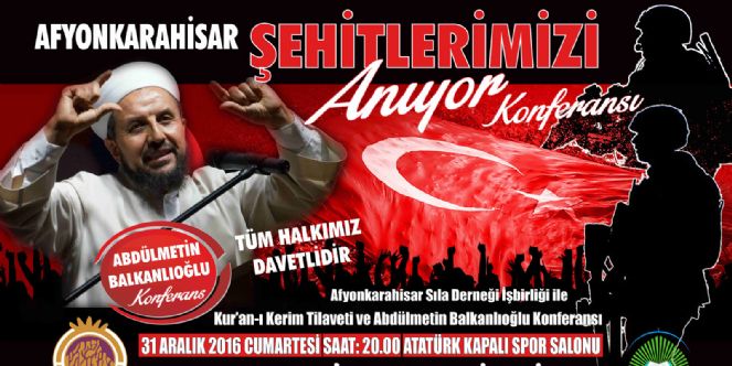 Afyonkarahisar Belediyesi ile Afyonkarahisar Sıla Derneği işbirliğinde Şehitlerimizi Anma Gecesi düzenlenecek. Abdülmetin Balkanlıoğlu’nun konuşmacı olarak katılacağı gecede Kur’an-ı Kerim tilaveti ve hatim duası yapılacak.
