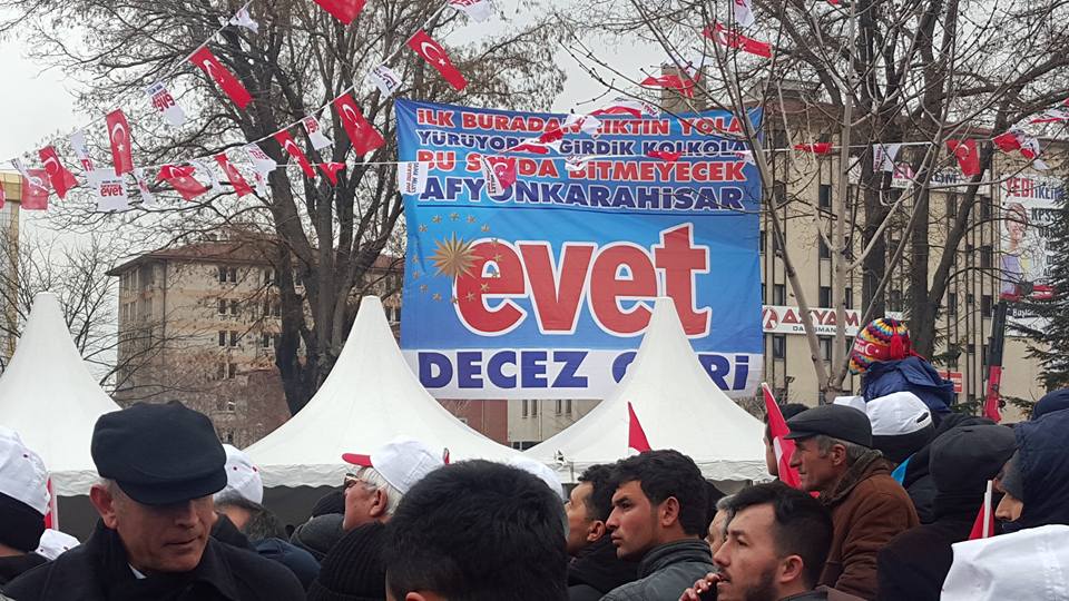 * Meydanın dört bir tarafı Cumhurbaşkanı Erdoğan’ın resimlerinin de olduğu ve halkoylamasıyla ilgili pankartlarla süslenmişti.