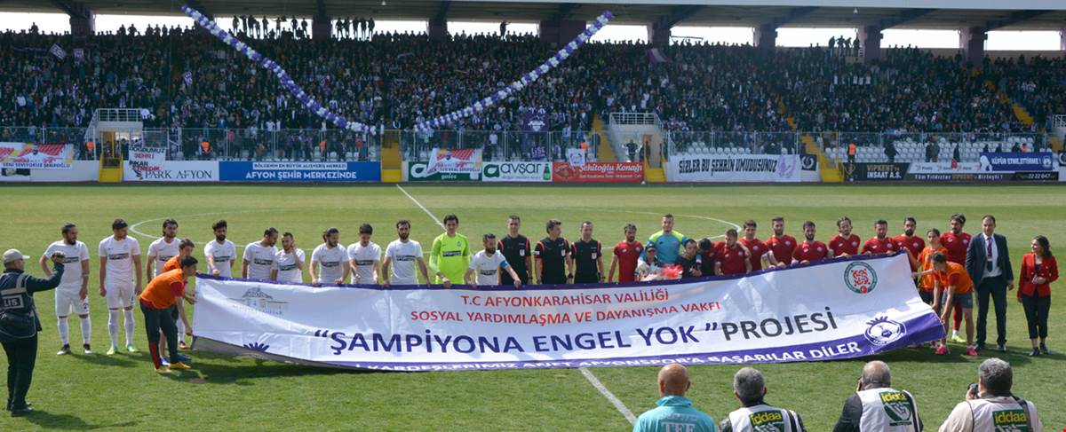 ÖMER BAĞLAN-Türkiye Spor Toto 3.Lig 3.Grup’ta 32. haftada oynadığı Ankara Adliyespor maçıyla şampiyonluğunu ilan eden ve gelecek yıldan itibaren 2. Ligde yarışacak olan Afjet Afyonspor’un şampiyonluğunda onların da payı var. Onlar, engelliler. Engellilerin sosyal hayatın içinde yer alması amacıya Afyonkarahisar Sosyal Yardımlaşma ve Dayanışma Vakfı tarafından hazırlanan ‘Şampiyona Engel Yok’ projesi hazırlandı. Proje kapsamında, engelliler, 14 Nisan Cuma günü Afjet Afyonspor’un şmapyopnluğu ilan ettiği maçı izlediler ve takımlarına büyük destek verdiler. Afyonkarahisar Yeni Şehir stadında Ankara Adliyespor ile oynanan ve Afjet Afyonspor 4-1 kazanarak ligin bitimine 2 hafta kala 74 puana ulaşarak Spor Toto 2. Lig'e yükseldiği maçta engelliler, ‘şampiyona engel yok mesajı’ verdiler ve futbolculara büyük destek oldular.