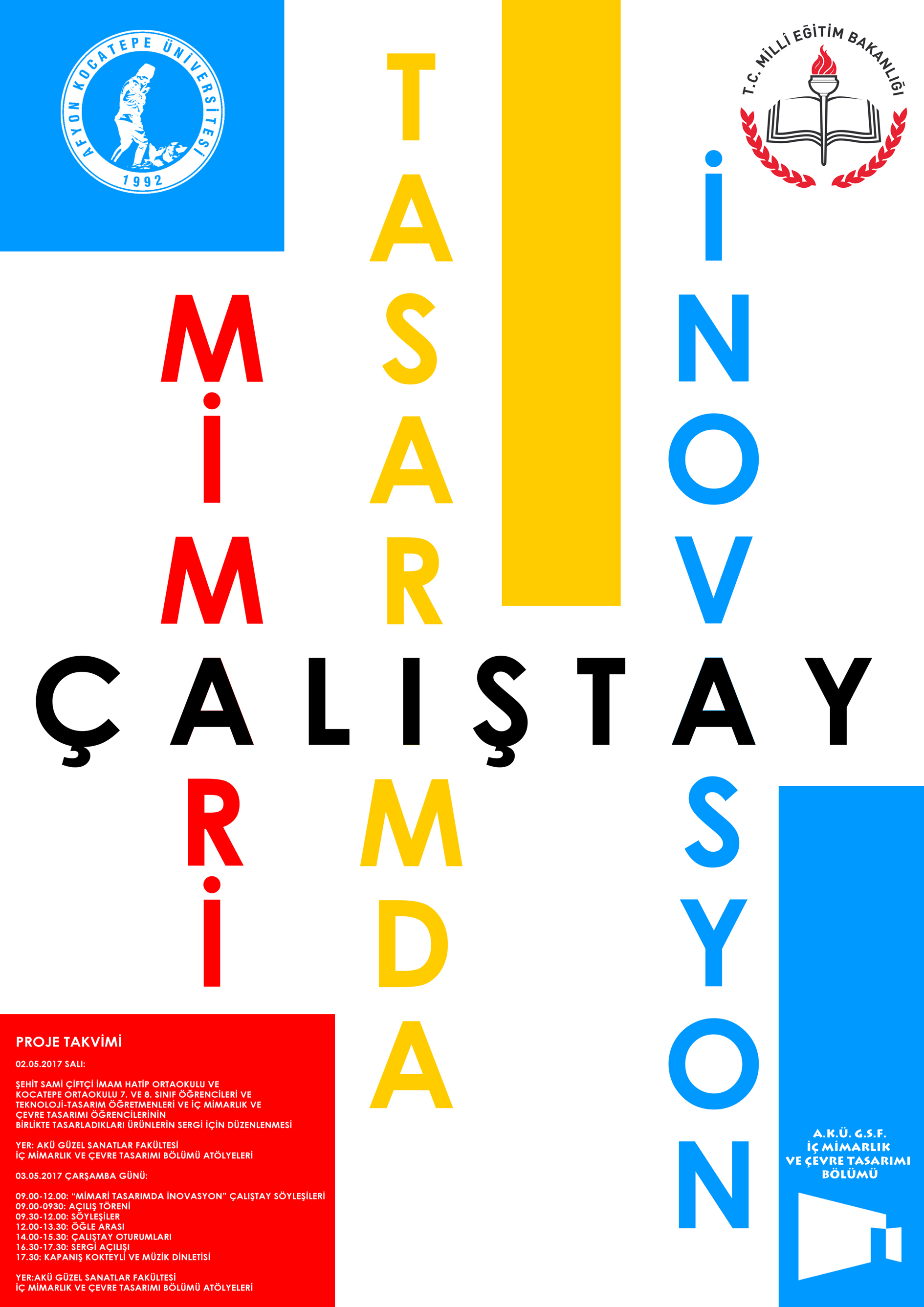 İki gün sürecek olan çalıştay kapsamında, 2 Mayıs 2017 Salı günü, Şehit Sami Çiftçi İmam Hatip Ortaokulu ve Kocatepe Ortaokulunun 7. ve 8. sınıf öğrencileri, AKÜ GSF İç Mimarlık ve Çevre Tasarımı Bölümü öğrencileri ile teknoloji-tasarım öğretmenlerimizin eşliğinde inovasyon temalı tasarlanan ürünleri, iç mimarlık bölümü atölyelerinde sergiye hazır hale getirilecek.