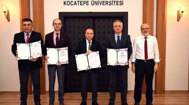 2019/21386 başvuru numaralı “Yüksek demir içerikli kalsiyum alüminat çimentolarının manyetik alan altında hidrate edilerek elektriksel özelliklerinin katkısız olarak artırılması” başlıklı patent için buluş sahipleri Prof. Dr. Taner Kavas ve Mert Gül adına Prof. Taner Kavas; 2019/21383 başvuru numaralı “Doğaltaş Görünümlü Dekoratif Duvar Kaplama Levhası” başlıklı faydalı model için buluş sahibi Prof. Dr. Tayfun Uygunoğlu; 2019/04074 Türk Patent ve Marka Kurumu başvuru numaralı ve 2019 8 0096300.5 Çin Patent numaralı “Yüksek Oranda Refrakter Metal ve Bor İçeren Nikel Esaslı İri Hacimli Metalik Cam Alaşımları” patent için buluş sahipleri Prof. Dr. Aytekin Hitit, Pelin Öztürk Aşgın, Öğr. Gör. Hakan Şahin, Doç. Dr. Ziya Özgür Yazıcı adına Prof. Dr. Aytekin Hitit belgelerini Rektör Karakaş’tan aldılar.
