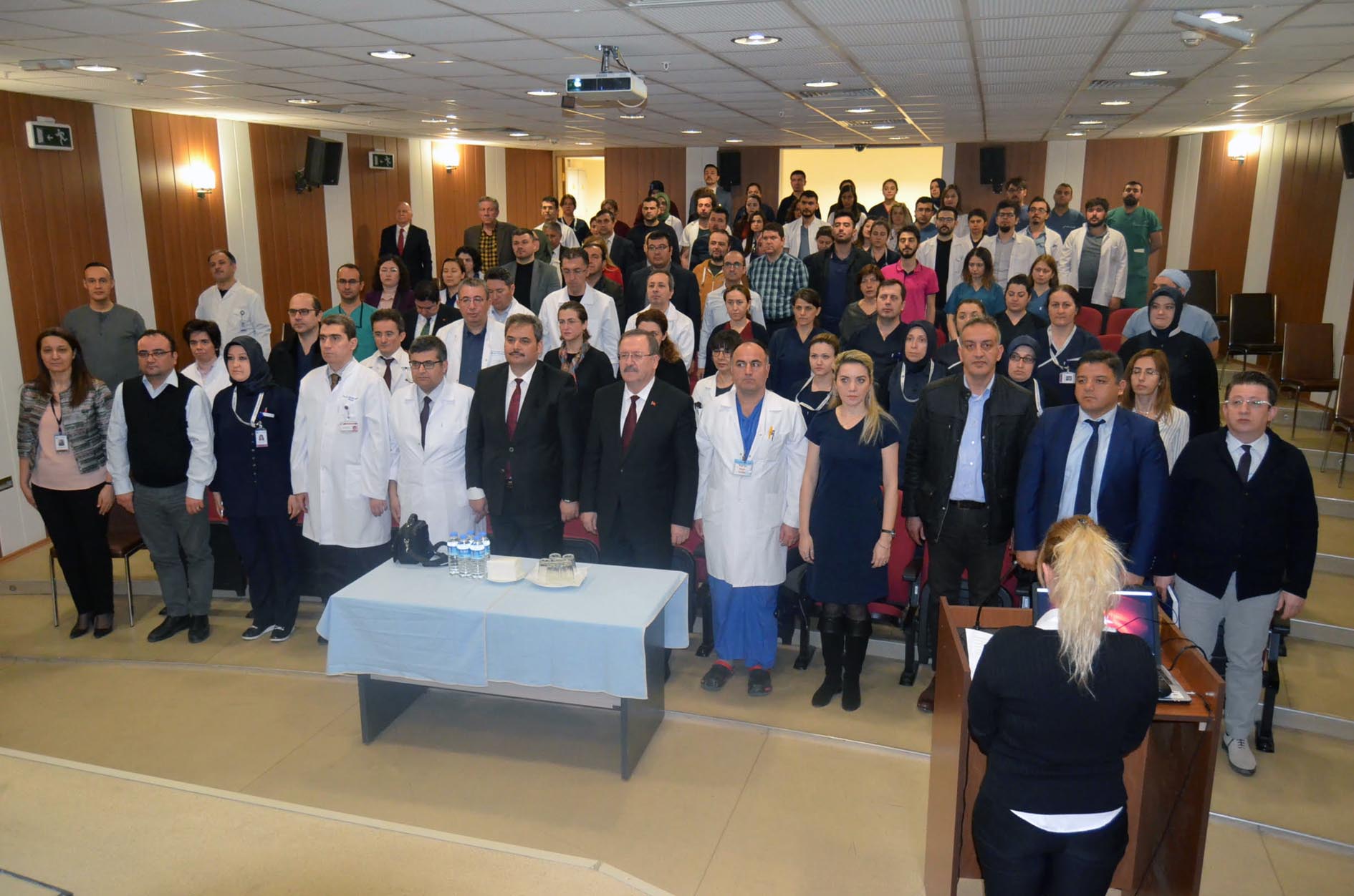 Törenin açış konuşmasını yapan Tıp Fakültesi Dekan V. ve Hastane Başhekimi Prof. Dr. Adem Aslan, bütün sağlık çalışanlarının tıp bayramını kutladı. Tıp Bayramının doğuş hikâyesine değinen Aslan, tıp bayramının sağlık hizmeti veren tıbbiyelilerin vatan savunma hareketi olarak başladığının altını çizdi. Aslan, devam etmekte olan Afrin Operasyonunda verilen terörle mücadelede de askerimize en büyük desteğin sağlık çalışanlarından geldiğini belirtti. Aslan, Tıp Bayramının ortaya çıkışı ile ilgili olarak “İngilizlerin işgali altındaki İstanbul’da askeri tıbbiyeli öğrenciler 14 Mart 1919 günü, okulun iki kulesi arasına büyük bir Türk Bayrağı asarak İngiliz işgalini protesto ettiler. Böylelikle ilk Tıp Bayramı sağlık hizmeti veren tıbbiyelilerin vatan savunma hareketi olarak başlamış ve günümüze kadar gelmiştir” ifadelerini kullandı.