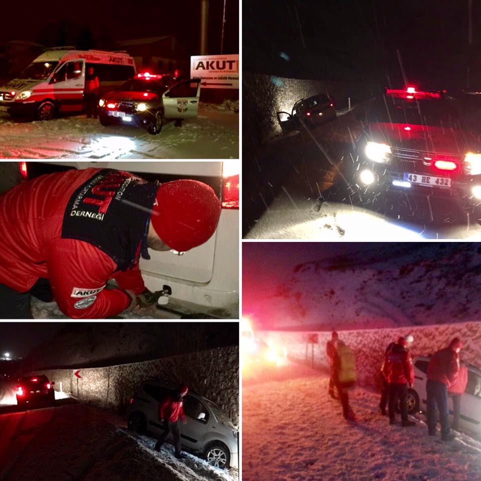 Edinilen bilgiye göre kendisine gelen bir ihbarı değerlendiren AKUT Afyonkarahisar ekibi,Afyonkarahisar Kütahya yolu Bayramgazi mevkiinde kayarak yoldan çıkan ve içerisinde mahsur kalan vatandaşların olduğu öğrenilen araçta bulunan vatandaşlara kurtardı.
