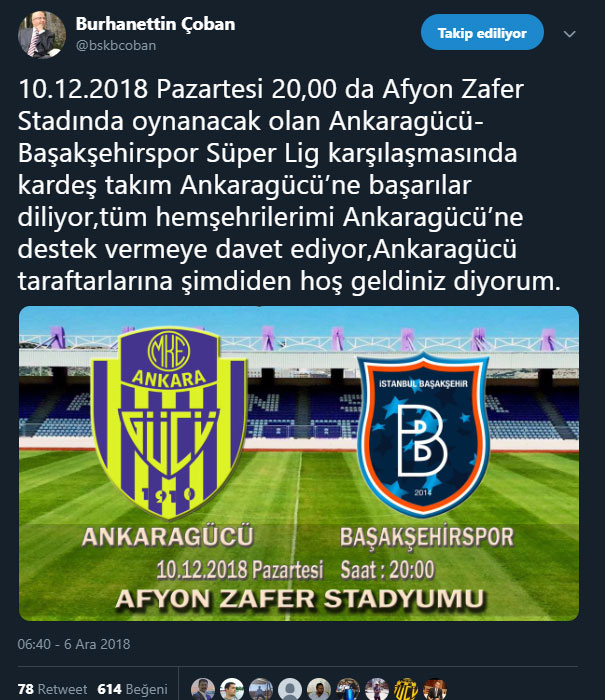 Belediye Başkanı Burhanettin Çoban, sosyal medya adresinden “10.12.2018 Pazartesi 20,00 da Afyon Zafer Stadında oynanacak olan Ankaragücü-Başakşehirspor Süper Lig karşılaşmasında kardeş takım Ankaragücü’ne başarılar diliyor,tüm hemşehrilerimi Ankaragücü’ne destek vermeye davet ediyor,Ankaragücü taraftarlarına şimdiden hoş geldiniz diyorum” şeklinde bir twit attı. Başkan Çoban’ın attığı twit tıklanma rekoru kırdı. Yaklaşık 40 bin kişinin görüntülediği destek mesajı bine yakın beğeni aldı. Çok sayıda taraftar ise yorumlarıyla Başkan Çoban’a teşekkür etti.