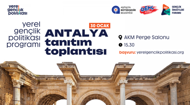 Antalya Yerel Gençlik Politikası Programı'nın tanıtım toplantısı, 30 Ocak Perşembe günü saat 15:30’da Atatürk Kültür Merkezi (AKM) Perge Salonu’nda gerçekleştirilecek. Gençler, gençlik çalışanları, belediye ve kamu kurum temsilcilerinin katılımına açık olan tanıtım toplantısına başvurular online olarak alınacak. Katılımcılar, başvurularını www.yerelgenclikpolitikasi.org adresinden yapabilecek.