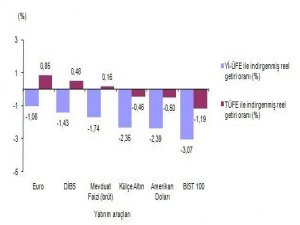 Yİ-ÜFE ile indirgendiğinde; yatırım araçlarından devlet iç borçlanma senetleri (DİBS) %1,43, mevduat faizi (brüt) %1,74, külçe altın %2,35, Amerikan Doları %2,39 ve BİST 100 endeksi %3,07 oranında yatırımcısına kaybettirdi. TÜFE ile indirgendiğinde DİBS %0,48 ve mevduat faizi (brüt) %0,16 oranında yatırımcısına kazandırırken; külçe altın %0,46, Amerikan Doları %0,50 ve BİST 100 endeksi %1,19 oranında yatırımcısına kaybettirdi.