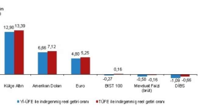 Yİ-ÜFE ile indirgendiğinde; yatırım araçlarından Amerikan Doları %6,66 ve Euro %4,80 oranlarında kazandırırken; BIST 100 endeksi %0,27, mevduat faizi (brüt) %0,58 ve Devlet İç Borçlanma Senetleri (DİBS) %1,09 oranlarında yatırımcısına kaybettirdi. TÜFE ile indirgendiğinde Amerikan Doları %7,12, Euro %5,25 ve BIST 100 endeksi %0,16 oranlarında kazandırırken; mevduat faizi (brüt) %0,16 ve DİBS %0,66 oranlarında yatırımcısına kaybettirdi.