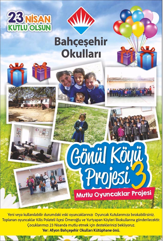 Afyon Bahçeşehir Okulları’nın sosyal projesi olan Gönülköyü’nün iki başarılı uygulamanın ardından üçüncü adımı Kilis’te atmak için harekete geçtiğinin altını çizen Genel Koordinatör Murat Taş, bu ilde 23 Nisan’da iki köyde oyuncak dağıtılacağını açıkladı. Taş, şu bilgileri verdi: “Gönülköyü projelerinin üçüncü Kilis’in Polateli ilçesine Ömeroğlu ve Yurtyapan köyleri ilkokullarına 23 Nisan ulusal egemenlik ve çocuk bayramı kapsamında çocuklarımızı sevindirmek anlamında hediye kampanyamızdır. ‘Mutlu oyuncaklar’ kampanyası adı ile başlattığımız kampanya da, okulumuz öğrencileri ve velilerinin desteği toplanacak oyuncaklar 23 Nisan haftasında Kilis’e ulaşacak ve çocuk bayramına bir renkte biz katacağız.
