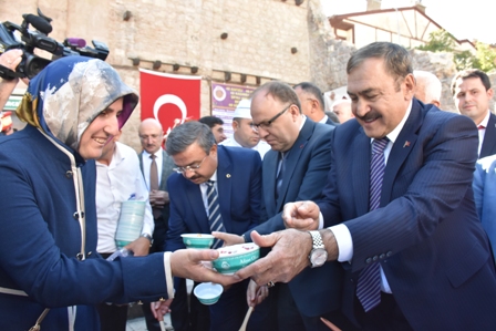 Orman ve Su İşleri Bakanı Veysel Eroğlu, binlerce vatandaşa 40 hatimli 40 kazanda pişirilerek hazırlanan şifalı aşureyi Mevlevi Türbe Camiin de dağıttı