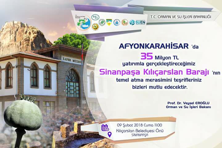 Orman Ve Su İşleri Bakanı Prof Dr Veysel Eroğlu'nun Teşrifleriyle Cuma Saat 11.00 ‘de Sinanpaşa ilçesine bağlı Kılıçarslan Beldesinde Baraj Temel Atma Töreni Yapılacak.35 milyon liraya mal olacak olan barajın kısa sürede bitirilmesi bekleniyor.