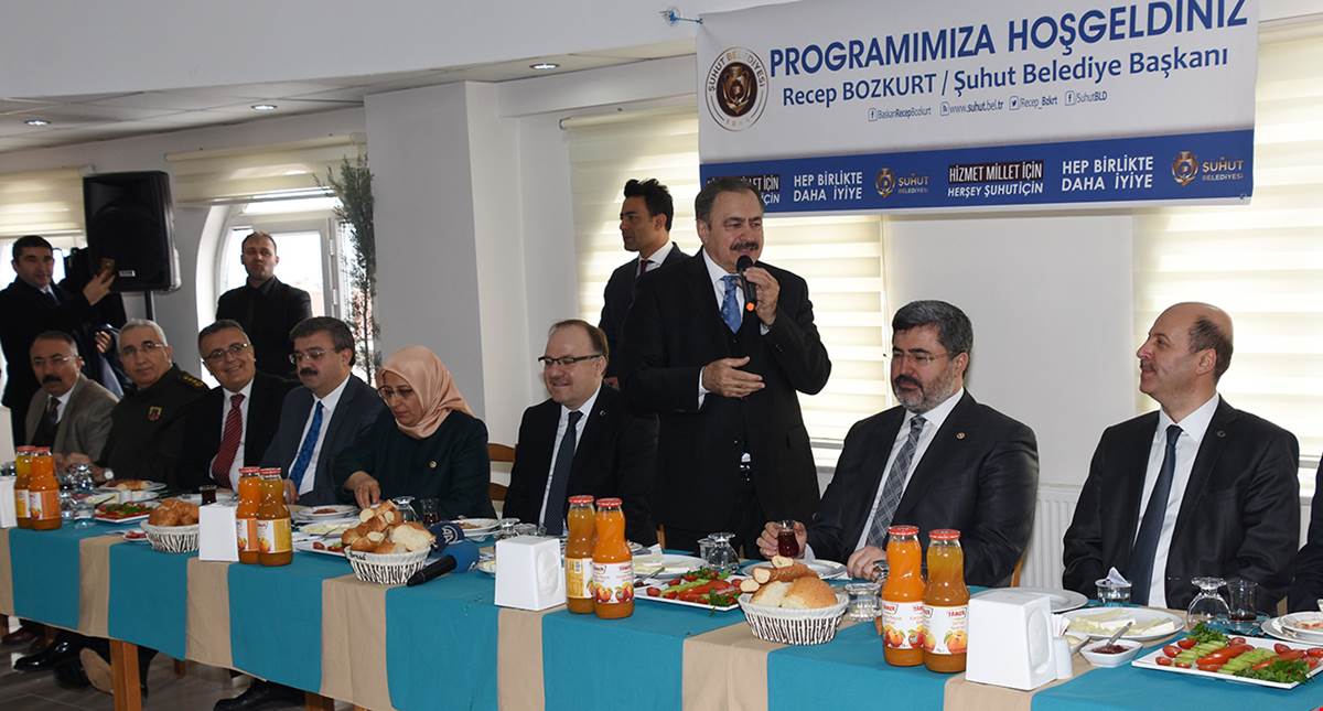 Son konuşmayı yapan Orman ve Su İşleri Bakanı Prof. Dr. Veysel Eroğlu; “Kardeşlerim ben de doğup büyüdüğüm bu memlekette sizlerle birlikte olmanın mutluluğunu yaşıyorum. Zaten her bayramda geliyoruz buraya. Elimizden geldiği kadar her türlü desteği veriyoruz, bundan sonra da vermeye devam edeceğiz. Şuhut Şuhut olalı böyle yatırım görmedi. Bunu özellikle ve gururla ifade ediyorum. Çünkü Şuhut’umuza her şey yapıldı. Belediyemize hakikaten gösterdiği büyük hizmetlerden dolayı teşekkür ediyorum. Şuhut modern bir hastaneye kavuştu. Şimdi hastanemize yeni uzmanlarda atandı, Allah'a şükür onun içinde Sağlık Bakanımıza teşekkür ediyoruz. Burası biliyorsunuz Şehitler Diyarıdır. Atalarımız anlatırdı dedelerimiz, ninelerimiz kahraman askerlerimizi buradan 25 Ağustos gecesi 26 Ağustos’a bağlayan gece Kocatepe'ye uğurladılar ve orada Büyük Taarruz emri verildi. İnşallah şimdi Kumalar Dağına kayak merkezi ve bir takım Jeotermal çalışmaları da yapıyoruz. Yollarımıza gelince Afyon Şuhut arasını daha sonra Afyon-Karaadilli-Isparta arasını bölünmüş yol yapacağız ve yollarımızı Afyon kaymağı gibi olacak. Özel idaremizin yaptığı muazzam çalışmalar var. Sevgili kardeşlerim hepinizi gönülden kucaklıyorum. Gerçekten Otelin ve iş merkezinin yapımında emeği geçen herkesi tebrik ediyorum. Şuhut çok güzel bir iş merkezine ve otele kavuştu. Hayırlı olsun. Sizler gerçekten saygıyla sevgiyle selamlıyorum Allah'ın rahmeti bereketi üzerinize olsun Cenab-ı Allah Afyonkarahisar’ımıza ve bütün ülkemize Halil İbrahim bereketi Lütfü eylesin bizleri sıhhat ve afiyetle daim eylesin.” dedi.
