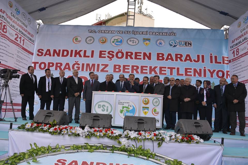 Orman ve Su İşleri Bakanı Veysel Eroğlu Sandıklı’da ilk olarak 75. Yıl İlkokulunda ağaç dikme programına katıldı. Buradan Sandıklı Belediye meydanında kalabalık bir vatandaş topluluğu tarafından soğuk ve yağışlı havaya rağmen coşkulu ile karşılanan Bakan Veysel Eroğlu, Sandıklı’da yapılacak olan 168 Milyon Lira maliyetli baraj, içme suyu, gölet ve dere ıslahı tesislerinin temelini attı. Sandıklı’da yapılacak olan Eşören Barajı ile ilgili açıklamalarda bulundu.