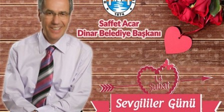 Dinar Belediye Başkanı Saffet Acar Sevgililer Günü ile ilgili bir mesajı yayınladı. Acar’ın yayınladığı mesaj şöyle: “14 Şubat Sevgililer Günü tüm dünyada kutlanan huzur, barış, sağlık ve sevgi içeren saygın bir gündür. İnsanların maddi değerlerden çok manevi değerlere de ihtiyacı olduğu bu günlerde birlik ve beraberlik dileklerimle tüm hemşerilerimin sevgililer gününü kutluyorum.”●İsmail Sagun