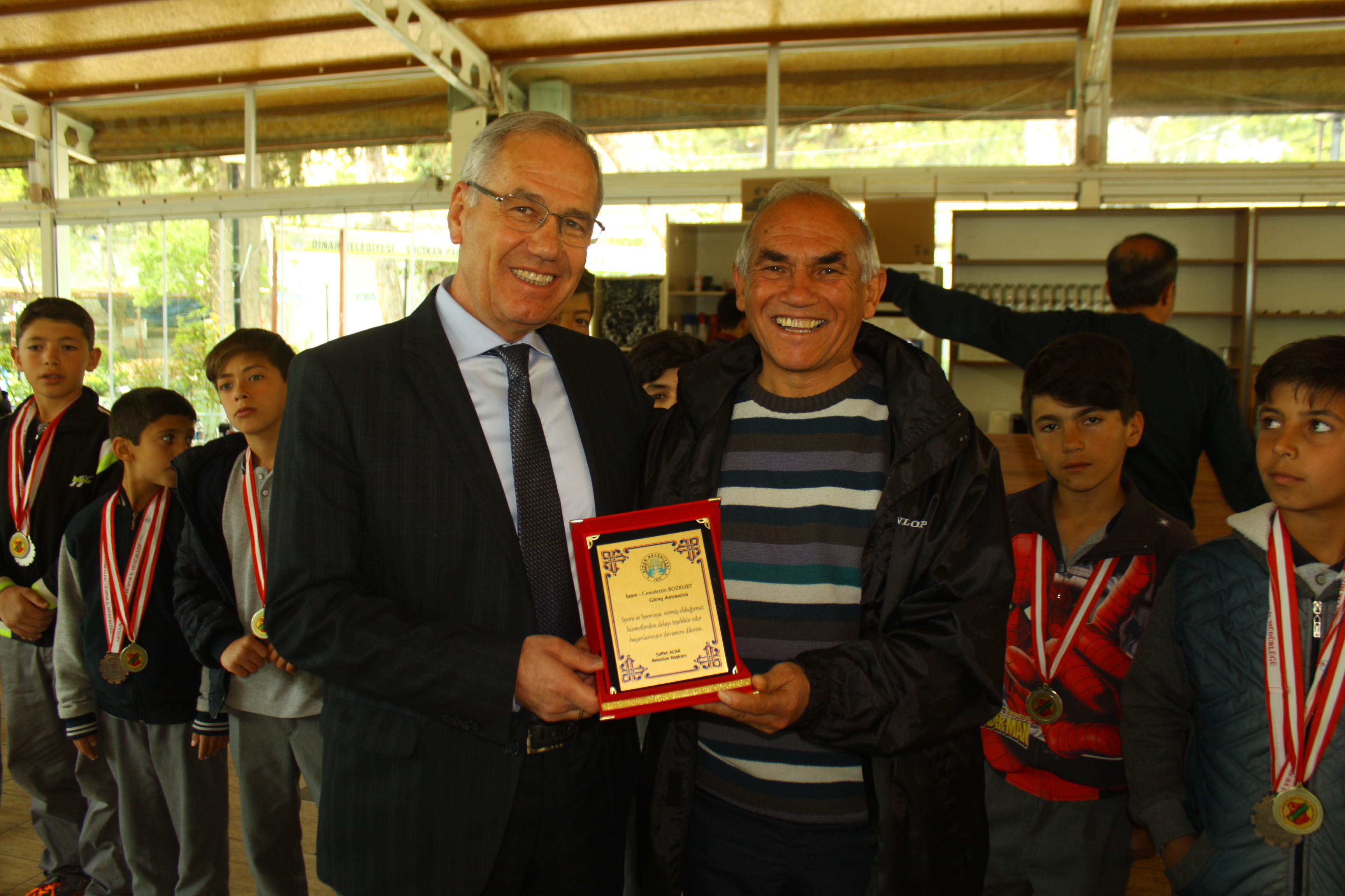Yapılan müsabakalar sonrasında madalya ve kupalar ile Dinar dönen güreş takımı, Belediye Başkanı Saffet Acar’ın misafiri olarak Suçıkan Park Tesislerinde ağırlandı. Güreş Antrenörü Cemalettin Bozkurt, Milli Güreşçiler Antrenörü Baki Öztürk ve Belediye Spor Tesisleri Amiri İbrahim Gökçe eşliğinde müsabakalarda derece yapan tüm minik güreşçilere Belediye Başkanı Saffet Acar tarafından da madalyaları verildi. Başkan Acar, spora ve sporcuya verdikleri hizmetten dolayı; Antrenör Cemalettin Bozkurt’a, Antrenör Baki Öztürk’e ve Dinar Belediye Spor Kulüp Başkanı Muammer Mazlum’a plaket takdim etti.