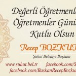 Şuhut Belediye Başkanı Recep BOZKURT, 24 Kasım Öğretmenler Günü dolayısıyla yayınladığı mesajında,”Türkiye’nin her anlamda büyük başarılara imza attığını belirterek, bilgi edinme ve öğrenme arzusunun var olduğumuz günden beri en temel ihtiyaçlardan biri olduğunu söyledi. Milletçe elde edilen bu başarıda yurdun dört bir yanında fedakârca hizmet eden öğretmenlerin emeğinin yadsınamaz olduğuna dikkati çeken Kılınç, “Donanımlı öğretmenlerimizin ellerinde yetişen çocuklarımız sizlerin sayesinde Yeni Türkiye’yi inşa edecektir. ‘insanı yücelt ki devlet yüceltsin’ anlayışını benimsemiş olarak insana yapılan her türlü yatırımı önemsiyoruz. Ve en büyük yatırımı eğitime yaptık. İnşallah, Türkiye’nin dört bir yanında bir eğitim seferberliği içerisinde bu yatırımlar devam edecek. Öğretmenleri, kendilerine emanet edilen çocukları ve gençleri en iyi şekilde yetiştirmek için gerekli bilgi donanımını sağlayan yol göstericiler” dedi. Başkan Bozkurt, mesajının sonunda “Bu duygu ve düşünceler ile tüm fedakar öğretmenlerimizin 24 Kasım Öğretmenler gününü en içten dileklerimle tebrik ediyor ve başarılar diliyorum” sözlerine yer verdi.