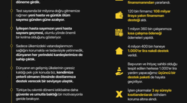 55 farklı ülkeye salgınla mücadele amaçlı malzeme desteği verdik. 4 milyon vatandaşımıza 22,3 milyar liralık bir kaynak tahsis edildi. Yaklaşık 450 bin esnafımız 8,4 milyar liralık finansman tahsisi yapıldı. 303 binin üzerinde esnafımız 8,5 milyar liralık Paraf Kart finansmanından yararlandı. 120 bin firmamız 108 milyar liraya yakın finansman desteği aldı. 1 milyon 360 bin çalışanımıza kısa çalışma ödeneği ödemeleri yapıldı. 4 milyon 400 bin haneye biner lira nakdi destek verildi. Başvuran ve ihtiyaç sahibi olduğu tespit edilen herkese biner lira yardım yapacağımız üçüncü bir destek paketi de hayata geçiriliyor. İşten çıkarmalar 3 ay süreyle kısıtlandırılarak istihdam koruma altına alındı. Adliyelerde 30 Nisan'da dolan ertelemelerin tarihini 15 Haziran'a kadar uzatıyoruz. Çiftçilerimizin kredi geri ödemelerini faizsiz olarak 6 ay erteliyoruz. Ar-Ge merkezleri ve Teknoparklarda evden çalışma sürelerini de 27 Mayıs'a kadar uzatıyoruz."