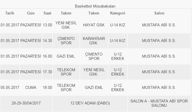 12 dev adam DABO müsabakalarına ise salon a ve Mustafa abi spor salonlarında cum cumartesi ve Pazar günleri oynanacak müsabakalarla devam edilecek.