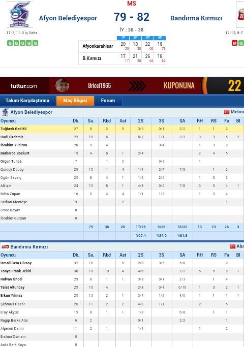 Afyon Belediye: Hadi Özdemir 15 sayı, 6 ribaund, Quincy Douby 15 sayı, 4 asist, Ali Işık 15 sayı, 8 ribaund