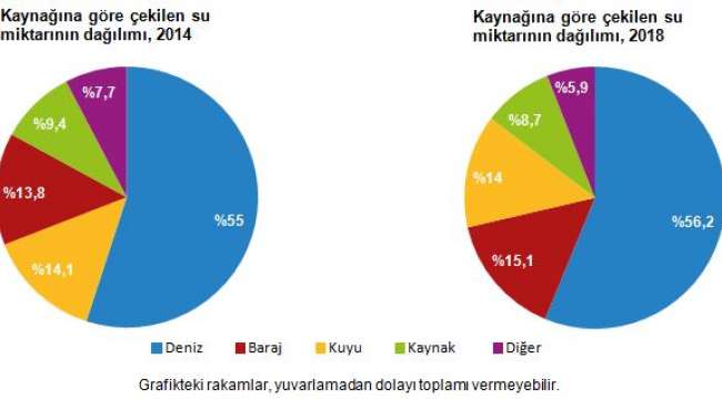 Türkiye'de 2014 yılında çekilen suyun %55'i denizden, %14,1'i kuyudan, %13,8'i barajdan, %9,4'ü kaynaktan ve %7,7'si diğer kaynaklardan temin edildi; 2018 yılında ise %56,2'si denizden, %15,1'i barajdan, %14'ü kuyudan, %8,7'si kaynaktan ve %5,9'u diğer su kaynaklarından temin edildi.