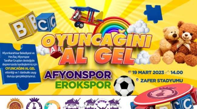 Afyonkarahisar Belediyesi ve Hes İlaç Afyonspor taraftar grupları Afyonkarahisar'daki depremzede kardeşlerimize destek olmak için kampanya başlattı. 'Oyuncağını al gel kampanyası' ile Hes İlaç Afyonspor ve Esenler Erok arasında oynanacak maçta, depremzede çocuklara bağış olarak binlerce oyuncak sahaya atılacak.