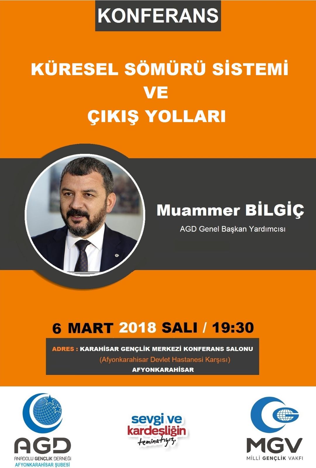 Araştırmacı Eğitimci Yazar Agd Genel Başkan Yardımcısı Muammer Bilgiç yarın 06 Mart 2018 Salı günü akşam 19.30'da Afyon Devlet Hastanesi Karşısı Karahisar Gençlik Merkezi Konferans Salonunda Küresel Sömürü Sistemi Ve Çıkış Yolları konulu konferans verecektir. Tüm Halkımız ve Basın Mensupları Davetlidir.
