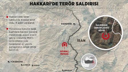 Olay, dün sabah saatlerinde İran sınırındaki Yüksekova İlçesi Esendere Beldesi'nde bulunan Susuzkeklik Karakolu ile Aslankaraş Üs bölgesi arasında meydana geldi. Karakoldan üs bölgesine giden askeri aracın geçişi sırasında, PKK'lı teröristler tarafından daha önceden yola döşenen el yapımı patlayıcı inflak etti. Yaralı askerler Yüksekova Devlet Hastanesi'ne kaldırılırken, bölgede hava destekli operasyon başlatıldı.