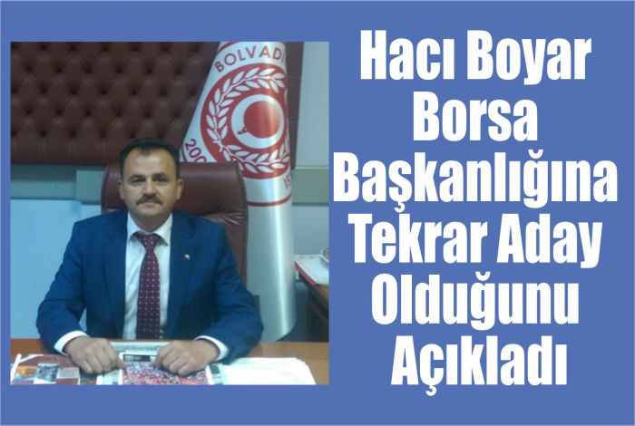 Bolvadin Ticaret Borsası Yönetim Kurulu Başkanı Hacı Boyar 03 Nisan 2018 Salı günü yapılacak Borsa Organ Seçimlerinde Gurubu ile birlikte tekrar aday olduklarını açıkladı.