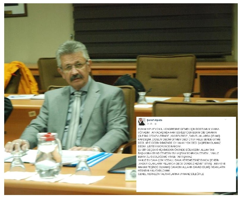 Şeref Alpata’nın, sosyal medya hesabından yazdıkları aynen şöyle: “Dün MHP Afyon il kongresine gitmek için dostumun yanına uğradım. Arkadaşım da hani eskilerden benim gibi davanın çilesini cezaevlerinde, hücrelerde, tabutluklarda çekmiş kardeşim. Gidelim dedim, gitmem dedi. Otur hele sen de gitme, dedi. Niye dedim. İkimizin de oy hakkı yok, dedi. Şaşırdım, olamaz, dedim, listeyi görünce inandım.