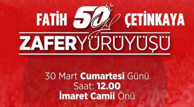 Fatih Çetinkaya'dan seçim öncesi Cumartesi günü Zafer Yürüyüşü yapacak.Bugün Saat 12:00 de İmaret Camii önünden başlayacak olan yürüyüşe tüm Afyonkarahisarlılar davet edildi.Çetinkaya sosyalmedya hesabından hemşerilerine çağrıda bulundu .