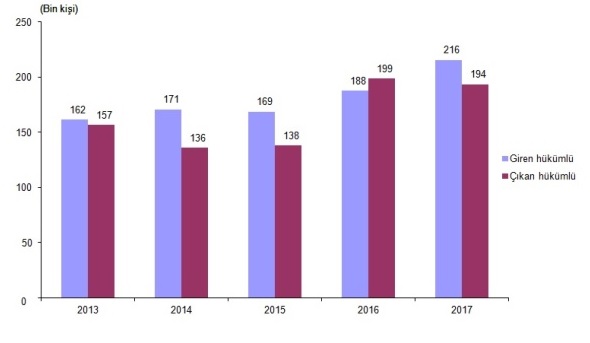 Bir hükümlünün aynı yıl içinde bir veya daha fazla giriş kaydı dikkate alındığında, 1 Ocak-31 Aralık 2017 tarihleri arasında ceza infaz kurumlarına 215 bin 761 hükümlü giriş kaydı yapıldı. Yine bir hükümlünün aynı yıl içinde bir veya daha fazla çıkış kaydı dikkate alındığında, aynı tarihler arasında 193 bin 662 hükümlünün çıkış kaydı yapıldı. Giren hükümlülerin %96,2'sini, çıkan hükümlülerin ise %96,1'ini erkekler oluşturdu.