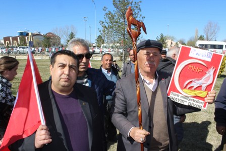 Dinar’dan geldiğini söyleyen bir ülkücü, bir elinde bozkurtlu asa, bir elinde de Atatrük resmi olduğu halde Kılıçdaroğlu’nu dinledi. Atatürk resminin üzerine MHP’li muhaliflerin resimlerini yapıştıran ülkücü, MHP Genel Başkanı Devlet Bahçeli’ye tepki gösterdi, kendisinin Türk kanı taşıdığını anlattı.