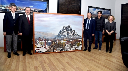 Afyon Kocatepe Üniversitesi (AKÜ) Güzel Sanatlar Fakültesi Yüksek Lisans Öğrencisi Dursun Arslan, Belediye Başkanı Burhanettin Çoban’a Afyonkarahisar’ı anlatan kale manzaralı yağlı boya tablosu hediye etti