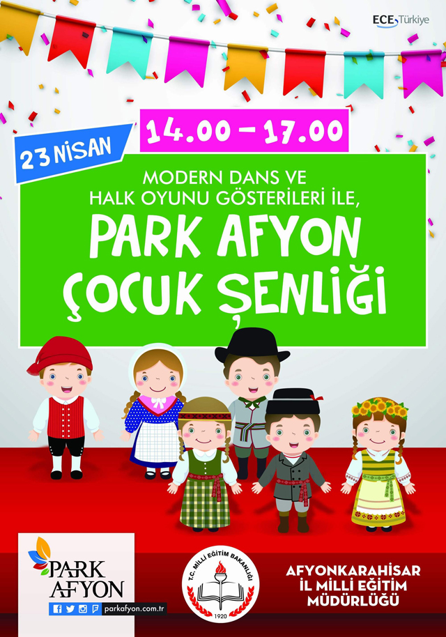 Eğlenceli etkinliklerle fark oluşturmaya devam eden Park Afyon AVM’de, Afyonkarahisar İl Milli Eğitim Müdürlüğü’ne bağlı 19 okul tarafından, 23 Nisan’da 14.00-17.00 saatleri arasında bir şenlik gerçekleştirileceği kaydedildi. Şenlikte halk oyunları ve modern dans, karate gösterileri, davul show gibi birbirinden eğlenceli muhteşem gösterilere ev sahipliği yapacak. Birbirinden yetenekli küçüklerin gösterileriyle adeta şölen yeri haline gelecek Park Afyon AVM’de çocuklar ve yetişkinler bayramın tadını doyasıya yaşayacak.