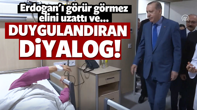 Yaşlı bir kadın hastanın "Ellerinizden öperim" diyerek, Cumhurbaşkanı Erdoğan'ın elini öpmek için doğrulmaya çalışması üzerine Erdoğan, "Yok, sana el öpmek yakışmaz, senin elini öperim" diyerek, kadının elini öptü.